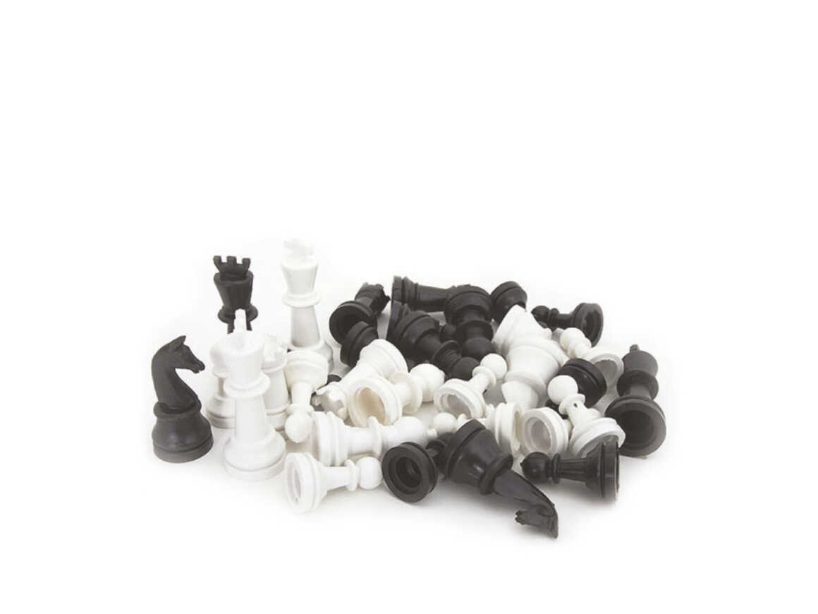Complete set of 32 plastic chess pieces in black and white with a King’s height 72 mm. and 52 mm.